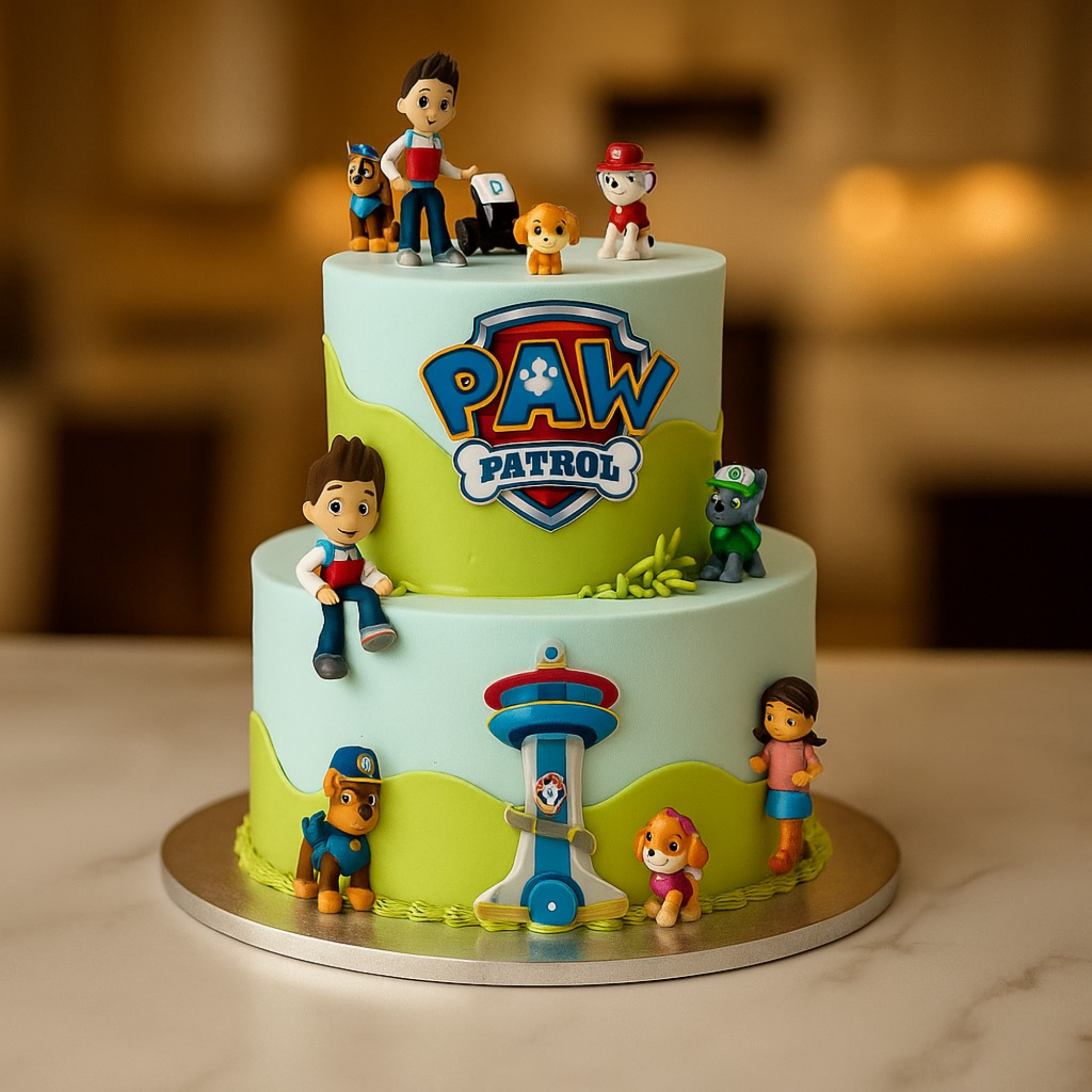 Heroic Paw Patrol-themed two-tier cake with bright designs and pups’ toppers.